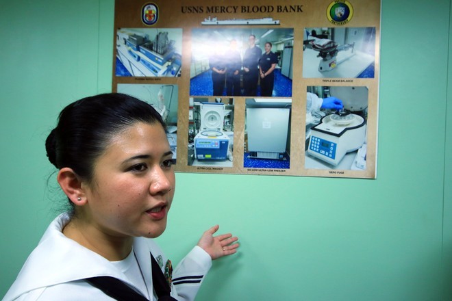 Một nhân viên y tế giới thiệu về ngân hàng máu sống được xây dựng suốt 10 năm qua trên tàu Mercy. Đây là nguồn máu dự trữ cần thiết và phát huy tác dụng trong nhiều trường hợp cấp cứu.