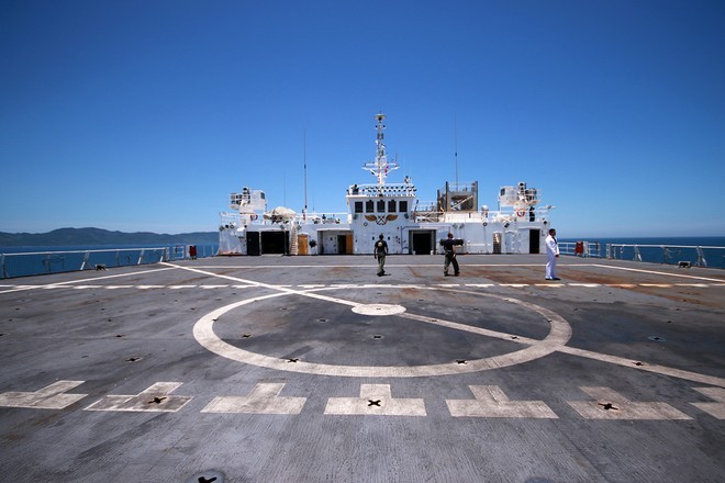 Phía boong sau tàu Mercy là sân đỗ trực thăng, phục vụ cho các tình huống cấp cứu khẩn cấp.