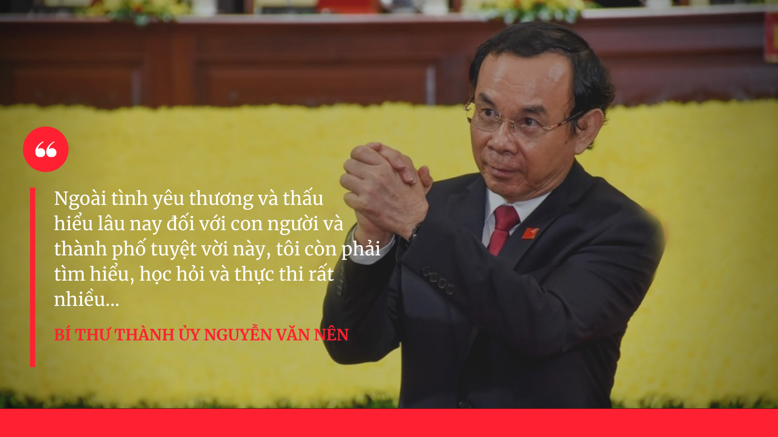 Bí thư Thành ủy TP. HCM Nguyễn Văn Nên: Mới là những bước đầu thôi anh. Ngoài tình yêu thương và thấu hiểu lâu nay đối với con người và thành phố tuyệt vời này, tôi còn phải tìm hiểu, học hỏi và thực thi rất nhiều...