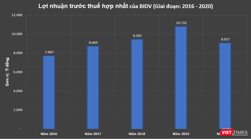 Như vậy, theo tính toán của VietTimes, BIDV đã hoàn thành 72% kế hoạch lợi nhuận trước thuế hợp nhất năm 2020. Kết quả kinh doanh hợp nhất trước thuế nêu trên cũng giảm 15,9% so với năm 2019.