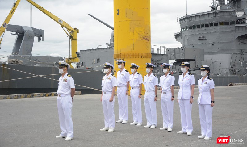 Để đảm bảo phòng, chống dịch COVID-19, lễ đón tiếp tuân thủ quy định giãn cách, các bên thực hiện nghi lễ đón tàu qua lan can |