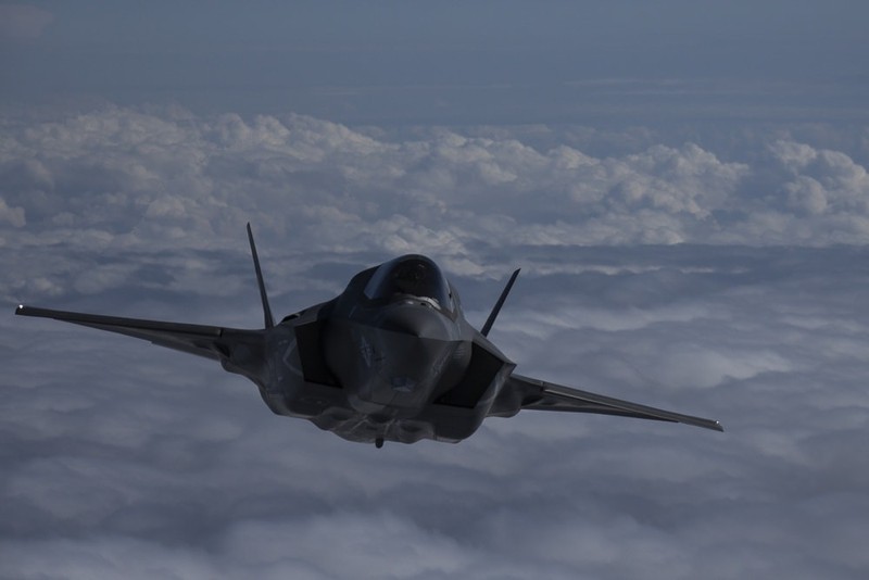 Ba chiếc tiêm kích phản lực tàng hình thế hệ 5 F-35B Lightning II, máy bay chiến đấu mới nhất và linh hoạt nhất thuộc quân đoàn Lính thủy Đánh bộ, bay từ cơ sở thường trú tại Căn cứ Không quân Hải quân Iwakuni, Nhật Bản, đến điểm tiếp cận với máy bay tiếp dầu trên không siêu nặng KC-130J thuộc phi đội tiếp dầu trên không (Marine Aerial Refueler) không đoàn vận tải số 152 (VMGR-152).