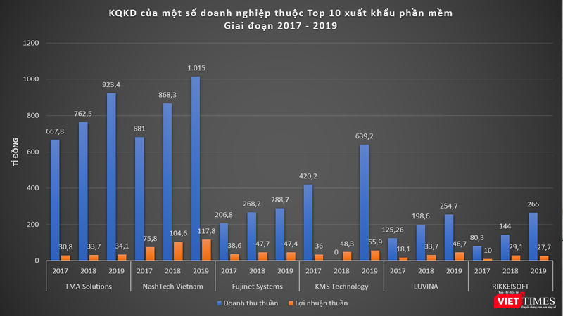 Dữ liệu của VietTimes cho thấy, trong giai đoạn 2017 - 2019, chỉ tiêu doanh thu thuần của các doanh nghiệp trên đều tăng trưởng qua các năm, tỷ suất sinh lời ở mức cao. Trong đó, nổi bật hơn cả là TMA Solutions và NashTech Vietnam.