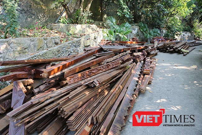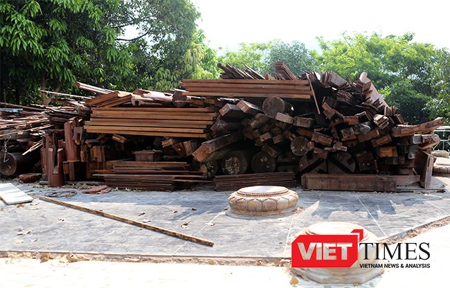 Tại hiện trường, hàng trăm khối gỗ quý là cột, dầm, mái của các ngôi nhà tại đây được tháo dỡ, đập phá, chất đống nằm la liệt khắp nơi. Một số tài sản quý được che phủ bạt, số còn lại chất đống ngổn ngang, phơi cùng mưa nắng.