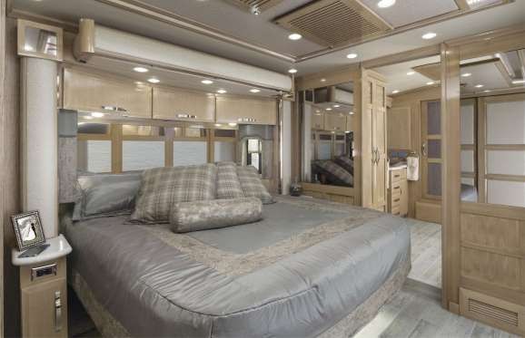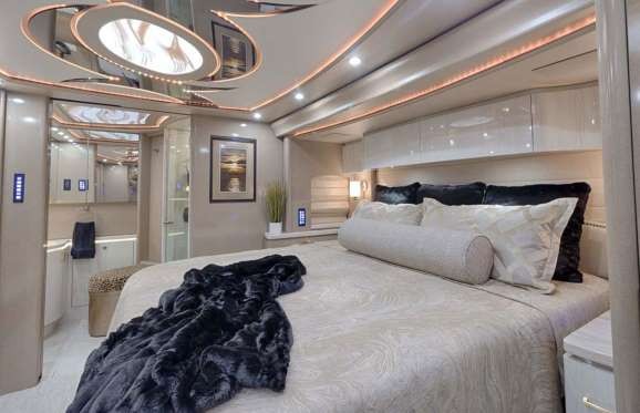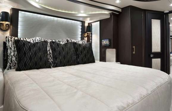 Có được giấc ngủ ngon lành trên đường dài là phần quan trọng của chiếc RV sang trọng này này. Phòng ngủ sang trọng được trang hoàng bằng chiếc giường King size lớn đặt nệm Eassy Slumber và bộ đồ giường theo kích thước yêu cầu của khách hàng.