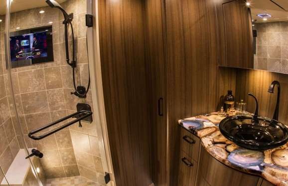 Phòng tắm có thể khiến người mua kinh ngạc, được lát đá cẩm thạch hồng sang trọng và gỗ chất lượng cao, vòi hoa sen khổ lớn tăng áp và một sự lôi cuốn không thể kháng cự, một chiếc TV không thấm nước được gắn ngay trong phòng tắm.