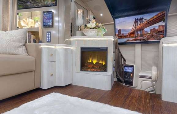 Để tái tạo lại cảm giác ấm áp tương tự như trong một ngôi nhà thực sự, dòng xe Marathon 2017 Prevost motorhome có lò sưởi giả có lửa điện tử ở phòng salon chính mà chủ sở hữu và khách có thể ngồi xung quanh trò chuyện.