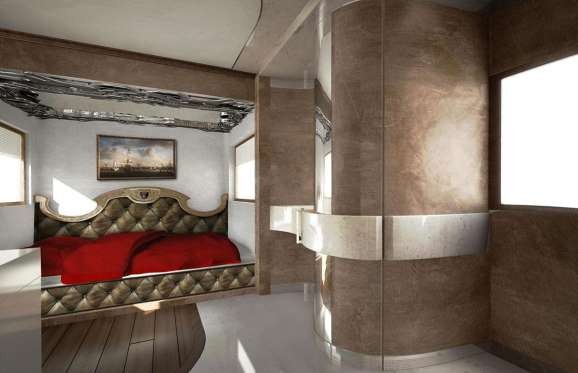 Phòng ngủ, cùng với phòng tắm riêng tuyệt đẹp, không thua kém gì phòng ngủ trên du thuyền của một tỷ phú. Trong phòng là một giường cỡ King size, nội thất hoàn toàn bằng gỗ đánh bóng và một chiếc TV treo 55 inch màn hinh cong 4K