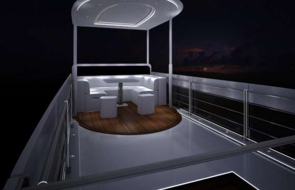 Căn nhà di động thậm chí có cả sân thượng dạng hộp đêm có cầu thang lên rất riêng. Khi không có thời gian đến những khu giải trí, tầng mái chuyển đổi thành không gian giải trí tuyệt vời với sàn nhảy / sàn boong tắm nắng và khu ngồi thư giãn có mái che.