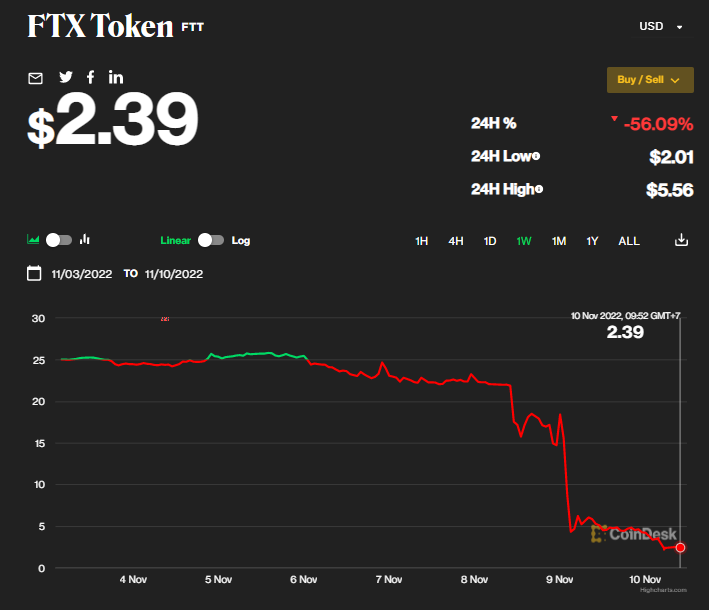 Cập nhật đến 9h ngày 10/11 (theo giờ Việt Nam), token FTT của sàn FTX đang được giao dịch ở mức 2,39 USD, giảm 56,09% trong vòng 24h qua, trong khi chỉ hai ngày trước, giá trị đồng này vẫn dao động quanh ngưỡng 22 USD.