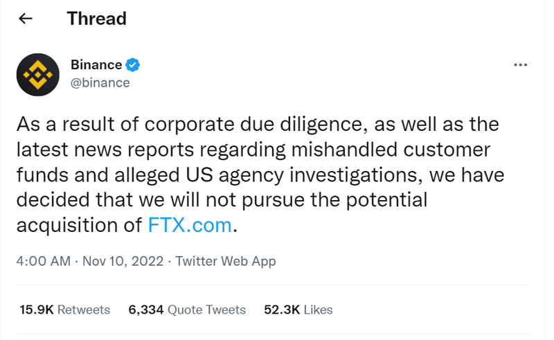 Cụ thể, Binance cho biết sẽ từ bỏ thương vụ mua lại FTX, đồng thời tiết lộ sàn giao dịch của tỷ phú Sam Bankman-Fried đang bị nhà chức trách Mỹ điều tra về việc sử dụng sai mục đích tiền gửi khách hàng.