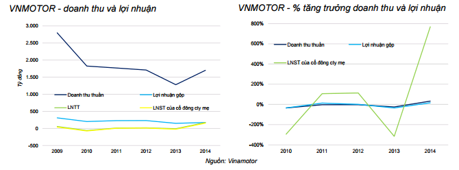 Theo ước tính của CTCP Chứng khoán TP.HCM (HSC), doanh thu và lợi nhuận trước thuế của Vinamotor sẽ vượt kế hoạch cả năm, doanh thu tăng 4,6%, tương ứng thu về 871 tỷ đồng và lợi nhuận trước thuế tăng mạnh 42%, tương đương 72 tỷ đồng so với năm 2014.