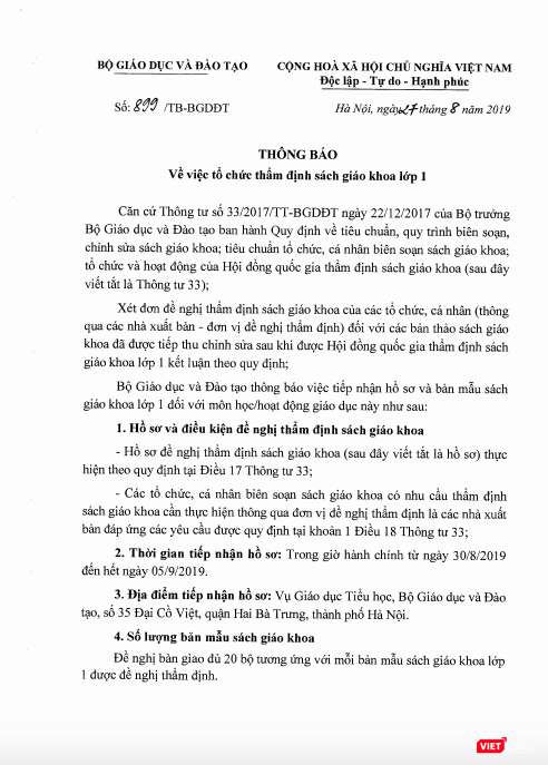 | Thông báo về việc tổ chức thẩm định sách giáo khoa lớp 1 |