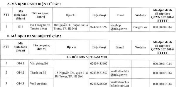 | Danh sách mã định danh điện tử của các cơ quan, đơn vị thuộc và trực thuộc Bộ TT&TT vừa được ban hành tại Quyết định 720. |