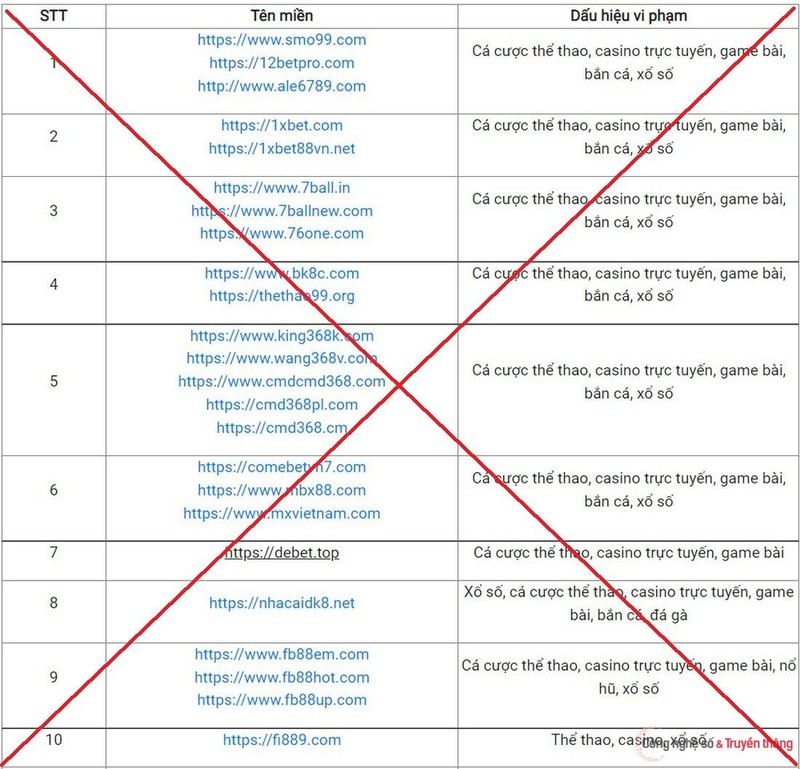Các dấu hiệu vi phạm của những website được Bộ TT&TT công bố lần này tập trung vào cá cược thể thao, casino trực tuyến, game bài, xổ số, đá gà, bắn cá, đua ngựa, lô đề…