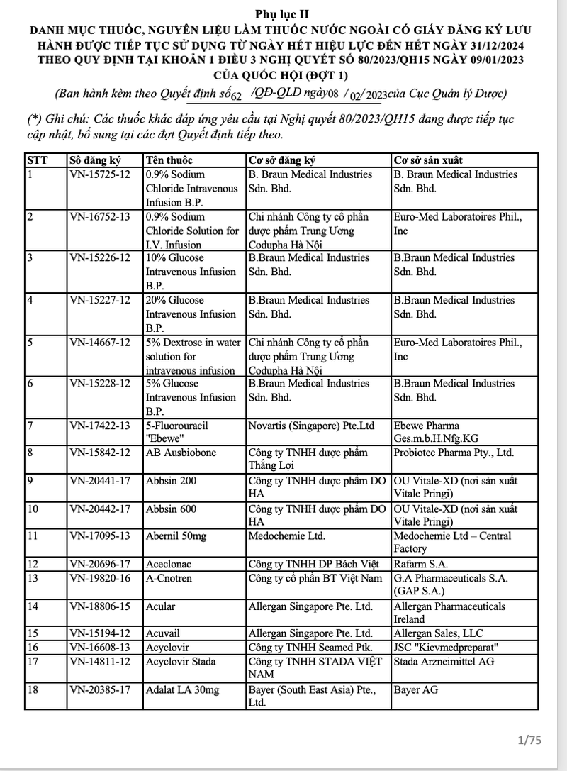 Quyết định 62/QĐ - QLD do ông Vũ Tuấn Cường - Cục trưởng Cục Quản lý Dược (Bộ Y tế) - ký, có hiệu lực ngay ngày 8/2/2023. Kèm theo Quyết định 62 là Danh mục 8.800 loại thuốc, nguyên liệu làm thuốc có giấy đăng ký lưu hành được tiếp tục sử dụng từ ngày hết hiệu lực đến hết ngày 31/12/2024 theo quy định tại khoản 1 Điều 3 Nghị quyết số 80/2023/QH15 ngày 09/01/2023 của Quốc hội (đợt 1).