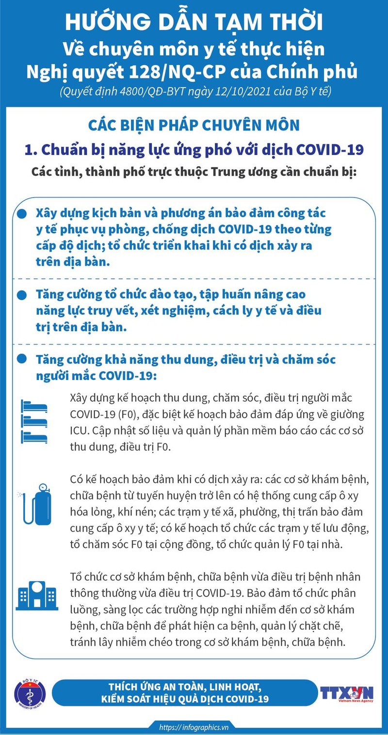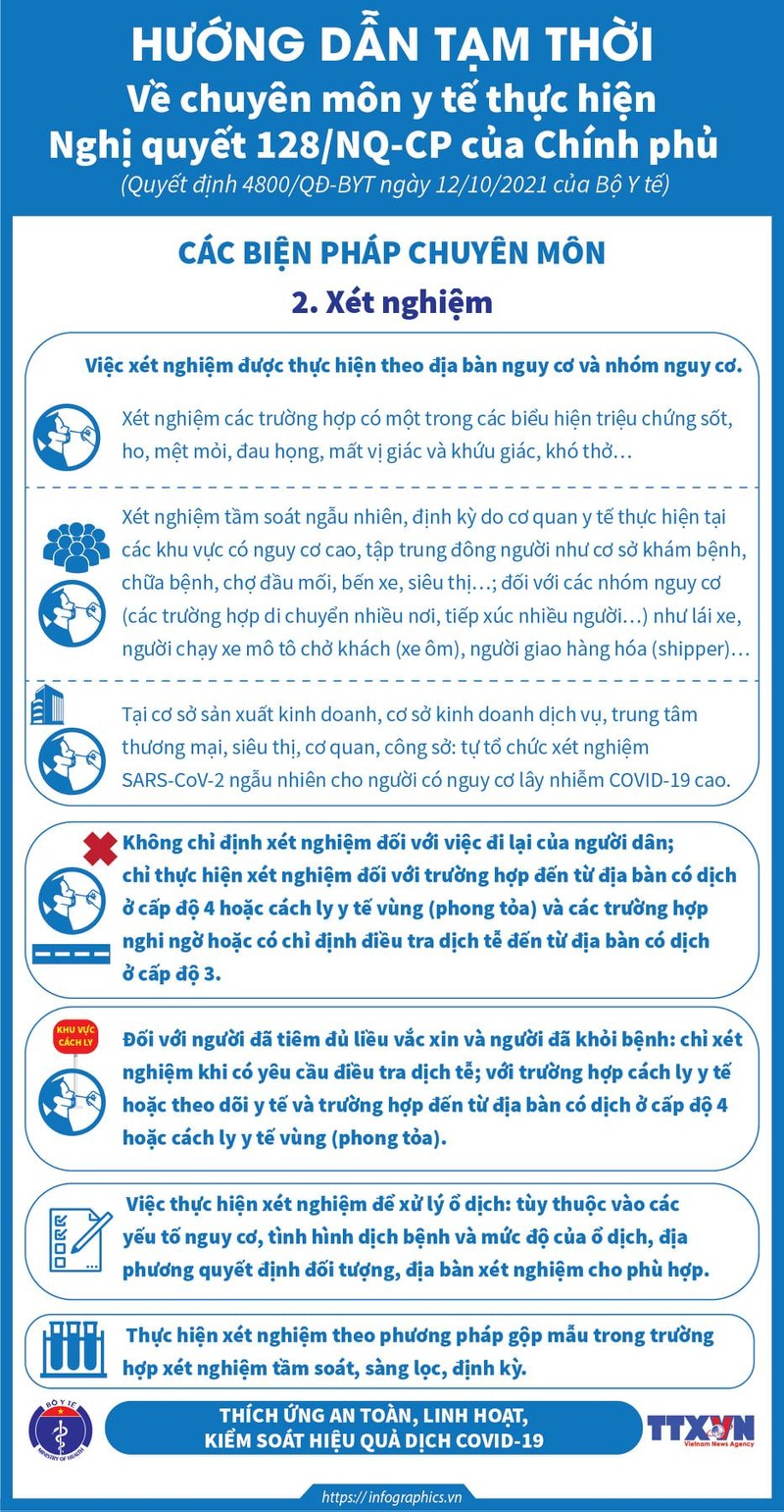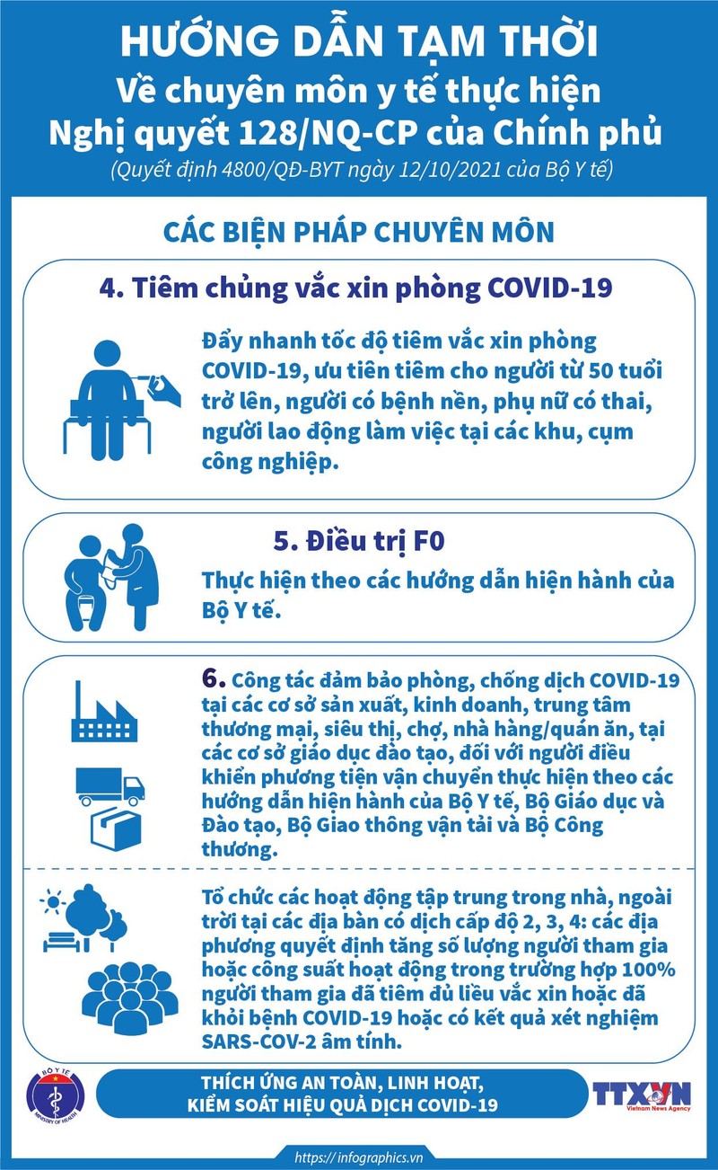 Thực hiện Nghị quyết 128/NQ-CP của Chính phủ, Bộ Y tế đã ban hành Quyết định hướng dẫn tạm thời các biện pháp chuyên môn y tế thực hiện Nghị quyết của Chính phủ ban hành Quy định tạm thời "thích ứng an toàn, linh hoạt, kiểm soát hiệu quả dịch COVID-19".
