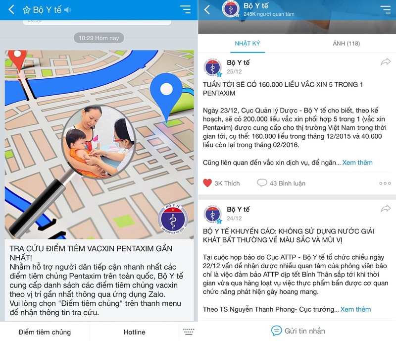 Chưa dừng lại ở đó, cuối tháng 12/2015, Bộ Y tế dùng Zalo gửi thông báo cho người dân để tra cứu các điểm tiêm chủng vắc xin 5 trong 1 Pentaxim gần nơi ở ngay trên trang Zalo chính thức của Bộ. Sau đó là một loạt các chiến dịch khác được Bộ phối hợp với Zalo thực hiện như sổ tiêm chủng trên Zalo giúp các bậc cha mẹ dễ dàng theo dõi quá trình tiêm chủng của trẻ hay nhận được tin nhắn khi sắp đến ngày tiêm; cẩm nang phòng chống virus Zika khi dịch bùng phát mạnh. Ngoài ra, Bộ cũng tạo điều kiện cho người dân có thể liên lạc tức thì với Bộ nếu gặp tình trạng bức xúc, nhũng nhiễu liên quan đến cán bộ ngành y hoặc muốn phản ánh tình trạng thực phẩm bẩn với Bộ trưởng thông qua số hotline từ tài khoản Zalo của Bộ Y tế.