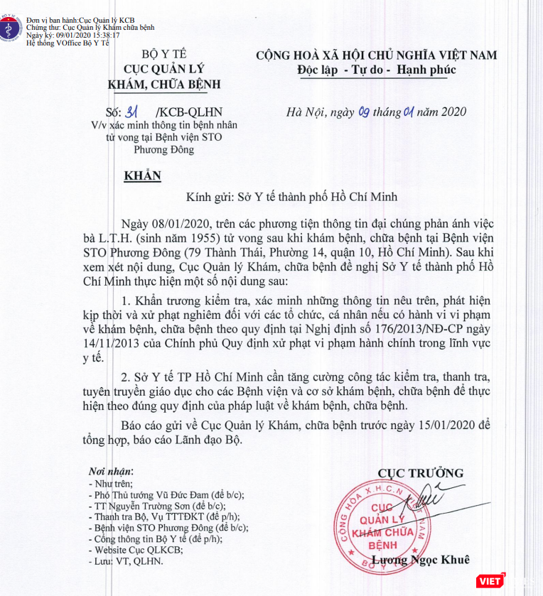 Theo Cục Quản lý Khám, chữa bệnh, ngày 8/1, báo chí đã phản ánh thông tin về bà L.T.H. (sinh năm 1955) tử vong sau khi khám, chữa bệnh (điều trị chấn thương gãy xương bánh chè khớp gối) tại Bệnh viện STO Phương Đông (địa chỉ: 79 Thành Thái, phường 14, quận 10, TP. Hồ Chí Minh).