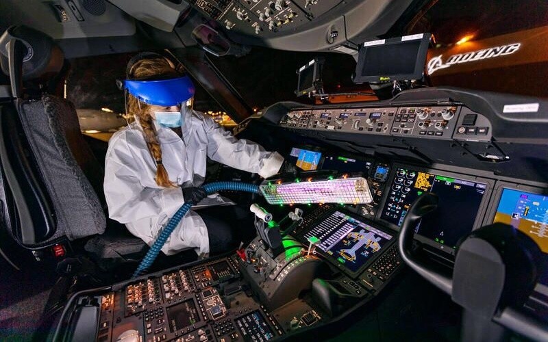 Thứ hai, Boeing phát triển đèn cực tím, giúp khử khuẩn khoang máy bay và buồng lái mà không cần đến các dung dịch khử khuẩn thông thường. Buồng lái có nhiều thiết bị điện tử và nhạy cảm với chất lỏng, do đó, sử dụng đèn cực tím giúp bảo vệ các thiết bị này. Đèn cực tím cũng sẽ có ích cho các hãng hàng không có tần suất khai thác lớn và phải liên tục vận hành máy bay. Gần đây, Boeing đã ký thỏa thuận hợp tác đối tác để sản xuất thiết bị này. Trong chương trình ecoDemonstrator, hãng cũng thử nghiệm lớp phủ kháng khuẩn có thể sử dụng tại các khu vực thường xuyên tiếp xúc trong khoang máy bay.