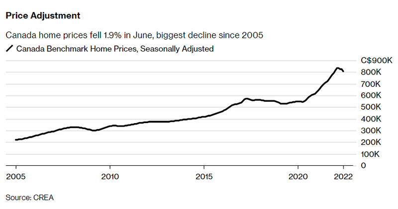 Royal Bank of Canada dự báo, đây sẽ là đợt điều chỉnh giá bất động sản lớn nhất mà nước này từng chứng kiến trong vòng 40 năm trở lại đây. Dữ liệu về doanh số bán nhà và giá nhà ở trong tháng 7/2022 dự kiến sẽ được công bố trong tuần tới. Trước đó, Toronto đã công bố chỉ số giá nhà ở giảm 3,9% - mức giảm lớn nhất trong vòng 4 tháng tính từ năm 2005.