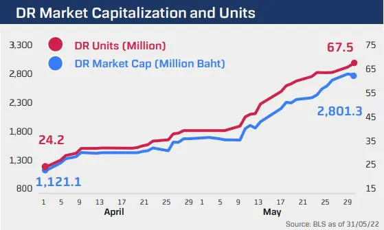 Trước đó, DR đầu tiên dựa trên DCVFM VN30 ETF (mã E1VFVN30) do Bualuang Securities phát hành từ năm 2018 cũng được nhà đầu tư Thái Lan rất ưa chuộng. Thời điểm cuối tháng 5, lượng DR E1VFVN30 đã lên tới 179,1 triệu đơn vị, tương ứng giá trị 5,9 tỷ Bath (khoảng gần 4.000 tỷ đồng).