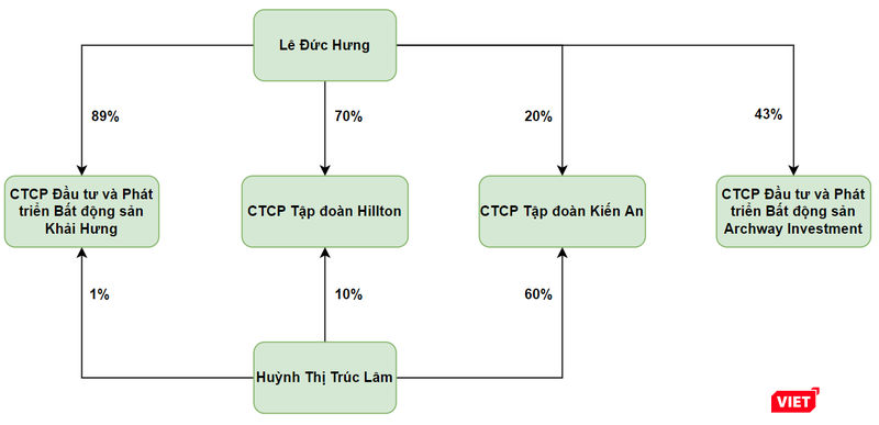 Ngoài Khải Hưng Corp, ông Lê Đức Hưng còn đang đứng tên tại một số pháp nhân khác như CTCP Đầu tư Xây dựng Hạ tầng Khải Hưng, CTCP Tư vấn thiết kế và Xây dựng Khải Hưng, hay cổ đông sáng lập góp 8,6 tỉ đồng, sở hữu 43% vốn điều lệ CTCP Đầu tư và Phát triển Bất động sản Archway Investment.
