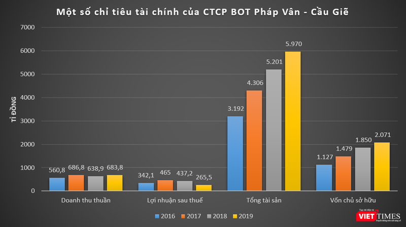 Dữ liệu của VietTimes cho thấy, năm 2016, BOT Pháp Vân - Cầu Giẽ ghi nhận doanh thu thuần đạt 560,8 tỉ đồng, lãi sau thuế lên tới 342,1 tỉ đồng, tương ứng với biên lợi nhuận 61%. Năm 2017, 2 chỉ tiêu này lần lượt tăng trưởng 22% và 36% lên mức 686,8 tỉ đồng và 465 tỉ đồng, tương ứng với biên lợi nhuận 67,7%.