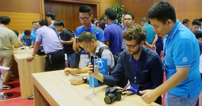 Phóng viên công nghệ nước ngoài trải nghiệm BPhone tại lễ ra mắt.