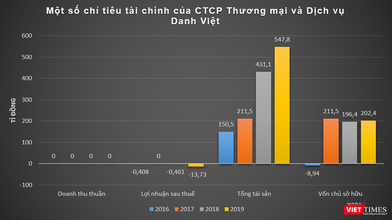 Dữ liệu của VietTimes cho thấy, trong giai đoạn 2016 - 2019, Danh Việt (công ty mẹ) không phát sinh doanh thu, báo lỗ sau thuế vài trăm triệu đồng mỗi năm. Cá biệt năm 2019, công ty này báo lỗ sau thuế lên tới 13,7 tỉ đồng.