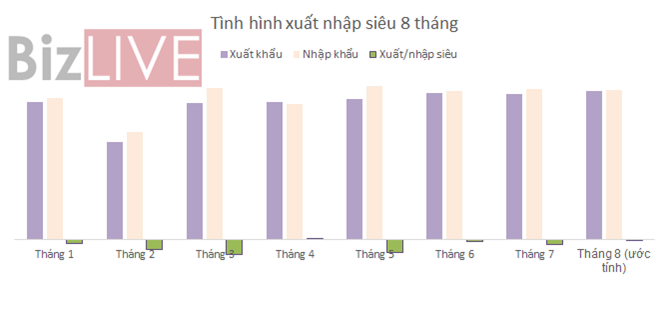 Mức nhập siêu vẫn hoàn toàn thuộc về khu vực kinh tế trong nước với con số đang tăng đáng kể qua các tháng. Trong khi đó, khu vực doanh nghiệp FDI xuất siêu 9,4 tỷ USD trong 8 tháng.