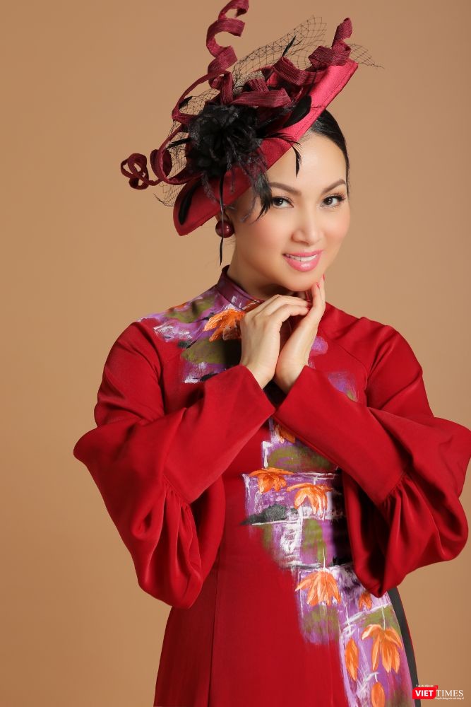 Chất liệu lụa, nhung the cao cấp được cắt may tỉ mỉ tôn lên đường cong gợi cảm của nữ ca sĩ nhưng vẫn giữ được sự nhẹ nhàng, kín đáo, ý nhị khi diện trang phục truyền thống.