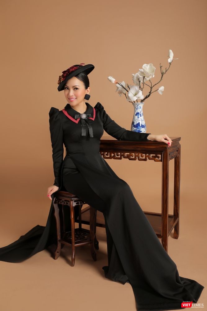 Trong gam màu đen, Hà Phương nổi bật với áo dài đi cùng phụ kiện