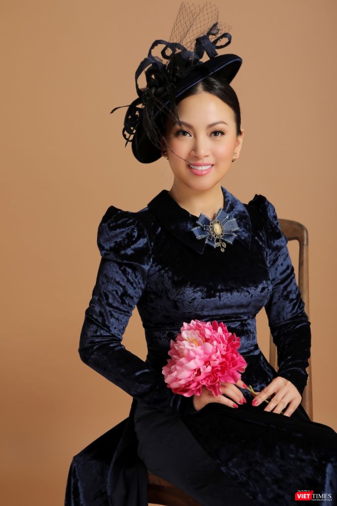 Ca sĩ Hà Phương tạo nên sự độc đáo, mới mẻ trong áo dài Việt Hùng với sự kết hợp cùng những chiếc mũ và găng tay, tạo độ sang chảnh, vẻ quý tộc cho áo dài.