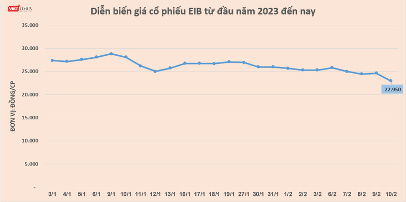 Sau khi xuất hiện tin đồn, kết phiên giao dịch ngày 10/2, cổ phiếu EIB giảm kịch biên độ xuống còn 22.950 đồng/cp.