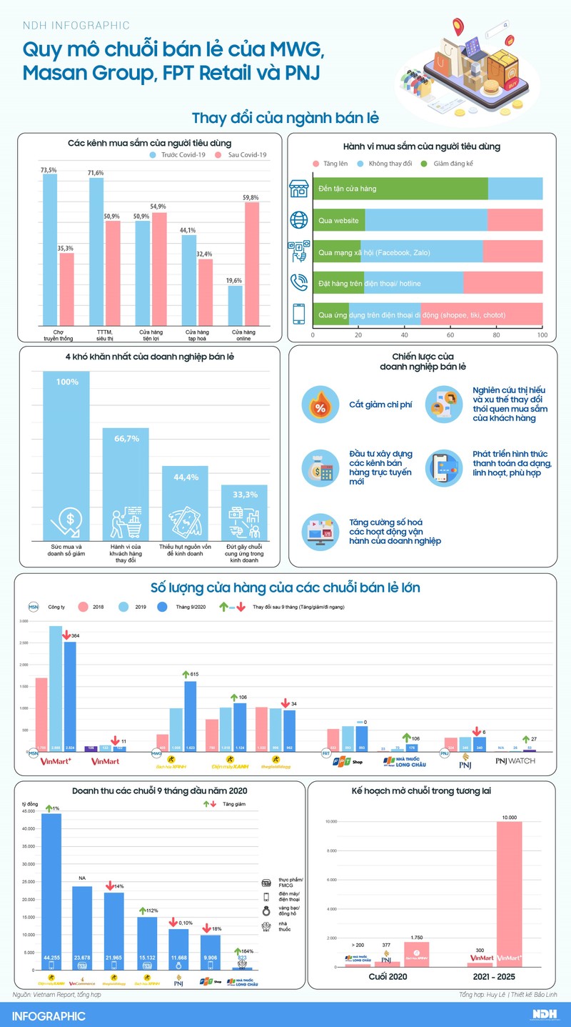 Ngành bán lẻ Việt Nam đã có những thay đổi lớn bởi đại dịch Covid-19, nhiều chuỗi kinh doanh đã phải đóng cửa nhưng cũng có nhiều đơn vị vẫn đang mở rộng hoạt động. Theo khảo sát của Vietnam Report, hoạt động mua sắm trực tiếp giảm trong đại dịch nhưng thương mại điện tử, mua sắm trực tuyến lại có tín hiệu tích cực.