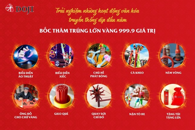 Riêng tại DOJI Tower Hà Nội và DOJI Tower TP. Hồ Chí Minh sẽ diễn ra nhiều hoạt động lễ hội truyền thống – hiện đại đan xen đa dạng như Biểu diễn ảo thuật - xiếc, chú hề phát bóng, ông đồ cho chữ vàng, nhân tượng, cà kheo, nặn tò he, ném vòng, gieo quẻ, quay sợi chỉ đỏ, tặng muối và lửa… Bên cạnh đó, hoạt động Hái lộc đầu Xuân sẽ được tổ chức xuyên suốt chương trình từ Mùng 6 đến Mùng 10 Âm lịch và hoạt động Bốc thăm may mắn với cơ hội trúng Vàng 999.9 diễn ra vào tối Mùng 10 sẽ dành cho tất cả khách mua hàng tại DOJI Tower.