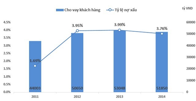 Nói nợ xấu trong năm 2014 giảm so với năm 2013 chỉ là giảm về mặt kỹ thuật do đã đẩy cục nợ lớn cho VAMC.Số nợ xấu ban đầu bao gồm cả 3.921 tỷ đồng nợ bán cho VAMC sẽ lên tới 5.868 tỷ đồng, gấp 2,8 lần số nợ xấu 2.117 tỷ đồng cuối năm trước. Trong khi đó, vốn điều lệ của ngân hàng hiện chỉ là 5.000 tỷ đồng. Vàtỷ lệ nợ xấu thực sự sẽ dâng lên 11,3% chứ không phải là 3,76%.