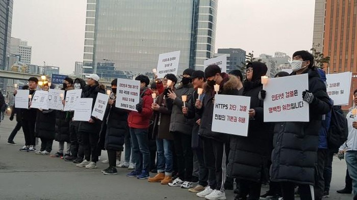 Thanh niên Hàn Quốc biểu tình đầu năm 2019 để phản đối việc chính phủ mạnh tay chặn web đen. Ảnh: Yonhap.