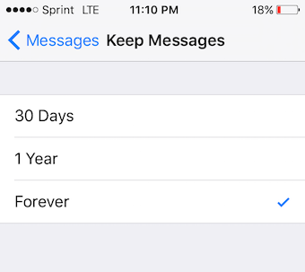 Bạn nên đặt khoảng thời gian nhất định để máy tự động xóa tin nhắn, thường là 30 ngày. Bạn vào Settings > Messages > Keep Messages, rồi thay đổi phần "Forever" sang "30 Days", hoặc "1 Year" (1 năm) tùy bạn. Thủ thuật này sẽ tiết kiệm khá nhiều dung lượng lưu trữ cho chiếc iPhone của bạn.