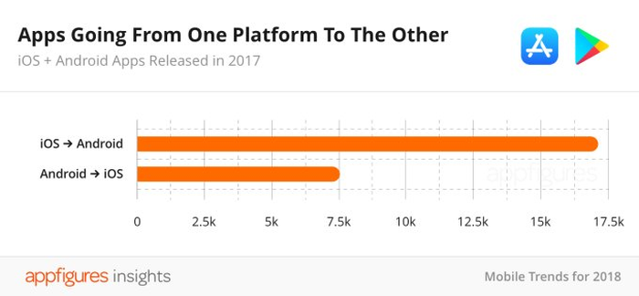 Ngoài ra, một số phần của ứng dụng Android mới phát hành trong năm là các ứng dụng từ iOS được chuyển sang Google Play. Một báo cáo từ Appfigures cũng cho thấy sự dịch chuyển từ iOS sang Android gấp đôi từ Android sang iOS vào năm 2017. Nghĩa là chính sự chất lượng từ Apple đã làm Android bắt đầu "bắt chước" theo, dù là ít nhưng chất lượng nhưng có lẽ nhà Táo vẫn phải xem lại trong thị trường cạnh tranh gay gắt như hiên nay.
