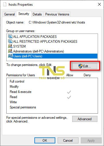 Bước 3: Ở trên bạn chọn Users…, phía dưới bạn đánh dấu tick vào ô Full Control, sau đó OK để xác nhận. Bước 2 và bước 3 để cấp quyền bạn sửa nội dung file hosts.