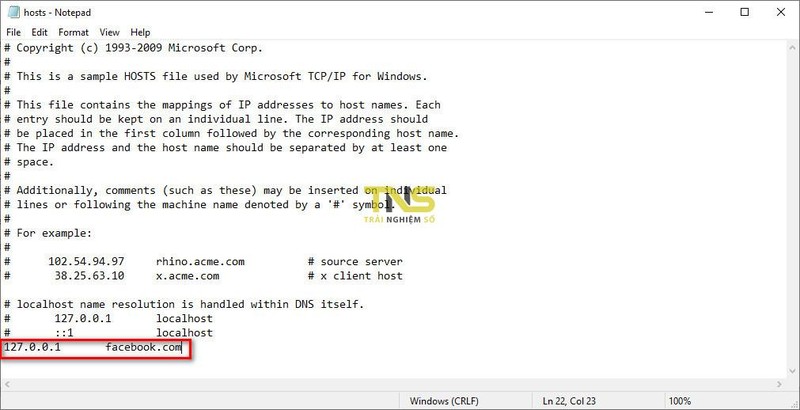 Bước 4: Mở file hosts lên bằng Notepad, khi muốn chặn web nào bạn chỉ cần thêm vào dòng 127.0.0.1 <tên trang web> như ảnh dưới.