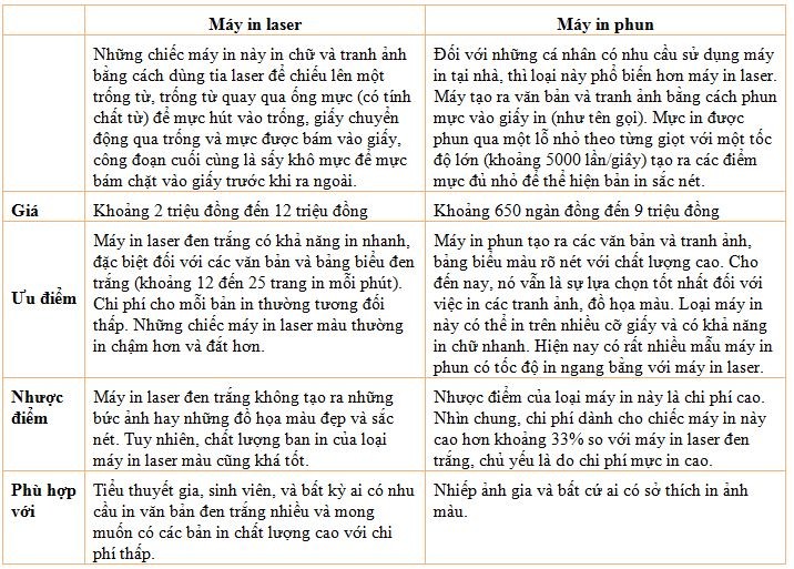 Mỗi loại – máy in phun hoặc máy in laser – đều có những ưu và nhược điểm riêng. Mời bạn tham khảo bảng so sánh sau để có quyết định cho riêng mình.