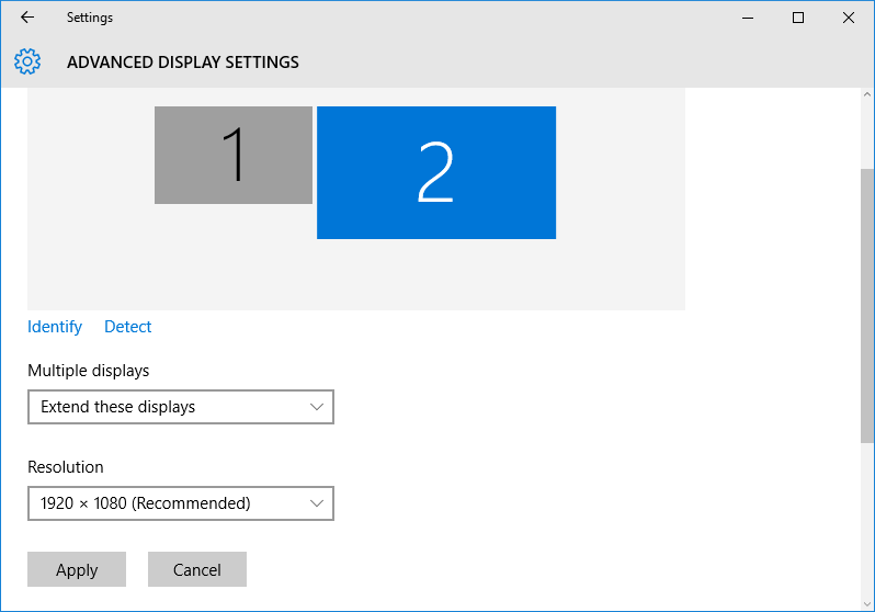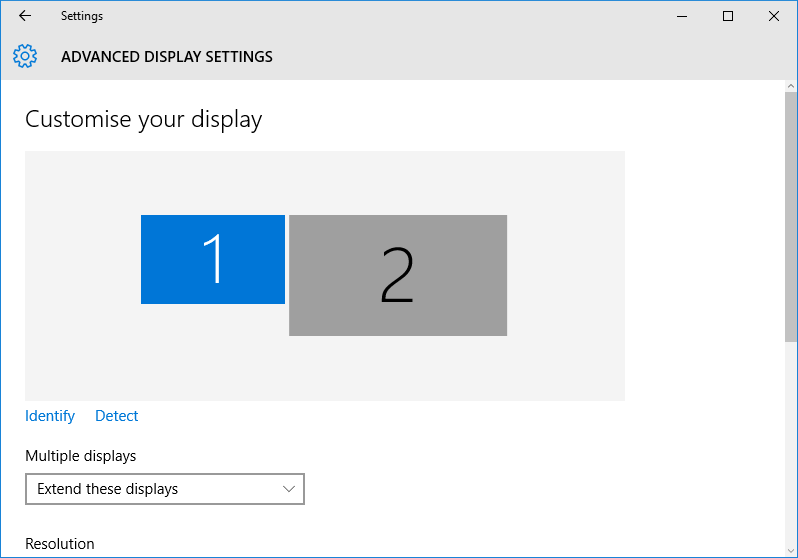 Tại màn hình Advanced display settings, bạn chọn màn hình bạn muốn thay đổi độ phân giải. Bạn đã biết màn hình nào là màn hình 1 và màn hình nào là màn hình 2 ở bước đầu tiên. Tuy vậy, nếu bạn bỏ qua bước đó, bạn có thể nhấn nút Identify tại màn hình này để nhận diện các màn hình của bạn.