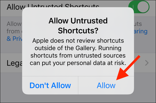 Lưu ý: Nếu bạn thấy tùy chọn Untrusted Shortcuts (Phím tắt chưa được tin cậy) bị mờ đi, bạn chỉ cần quay lại ứng dụng Shortcuts (Phím tắt), sau đó chạy một phím tắt bất kỳ trong bộ sưu tập. Hoàn tất, bạn quay lại phần Settings (Cài đặt) > Shortcuts (Phím tắt) và bạn sẽ thấy tùy chọn Untrusted Shortcuts (Phím tắt chưa được tin cây) đã sáng lên.