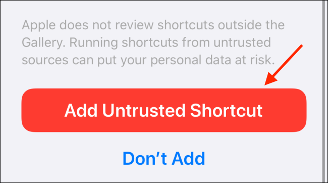Thao tác này sẽ mở shortcut trên ứng dụng Shortcuts (Phím tắt). Tại đây, bạn hãy vuốt xuống dưới và bấm nút Add Untrusted Shortcut (Thêm phím tắt không được tin cậy).