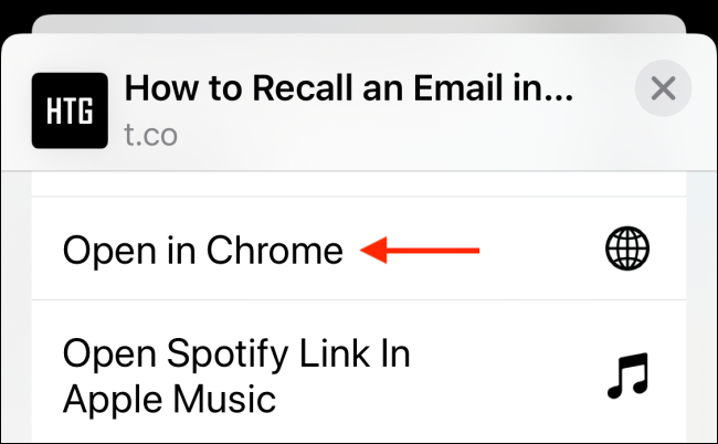 Tiếp theo, bạn tìm phím tắt Open In Chrome trên trình đơn chia sẻ và bấm lên nó.