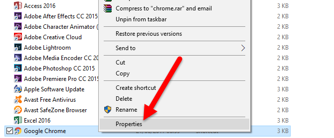 Nếu chọn từ Start Menu trên Windows 10, nhấn chuột phải vào biểu tượng Google Chrome -> More -> Open file location -> nhấn chuột phải vào Google Chrome trong cửa sổ Programs mới hiện ra -> Properties.