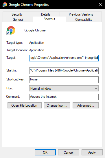 Từ giờ Chrome sẽ luôn khởi động ở chế độ ẩn danh khi được mở từ shortcut này. Nếu dùng shortcut khác, bạn phải lặp lại các bước để tùy chỉnh. Nếu không muốn mở Chrome với chế độ ẩn danh nữa, xóa phần -incognito đã thêm trước đó.